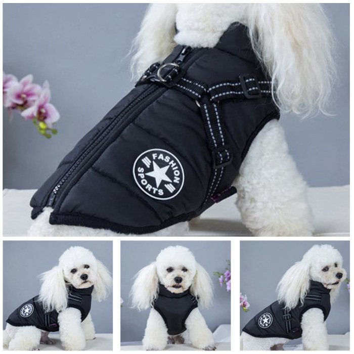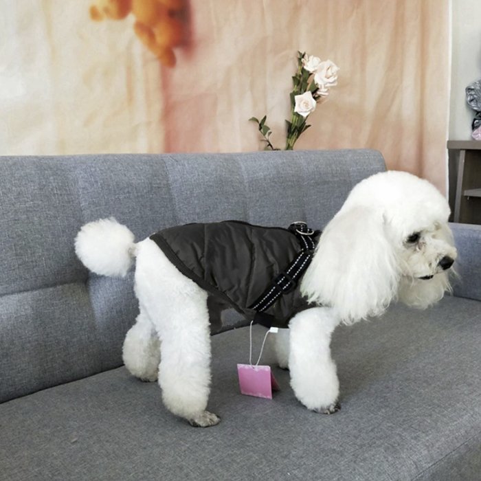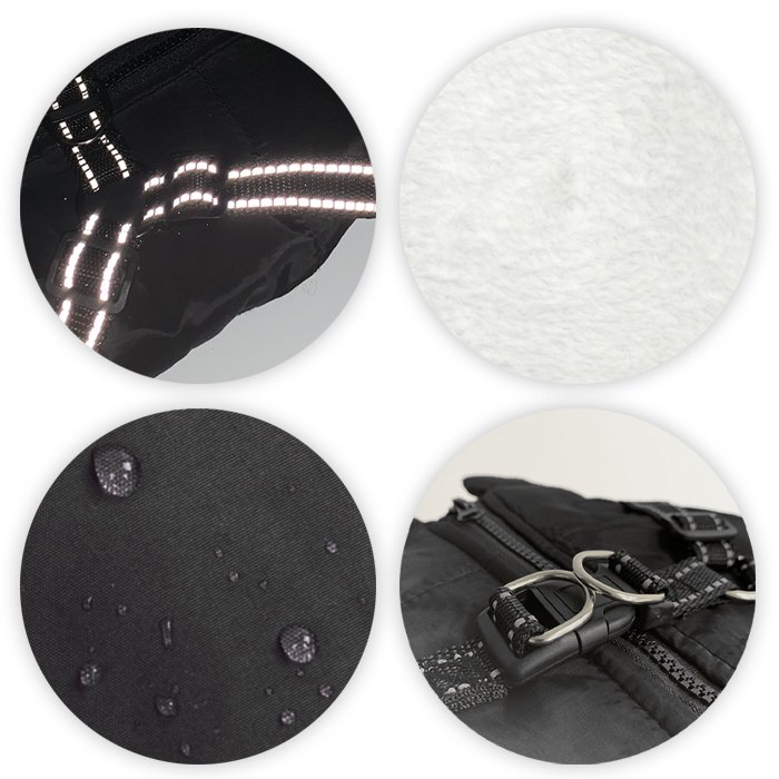 Το παλτό σκύλου είναι κατασκευασμένο από αδιάβροχο ύφασμα, είναι καλά ανθεκτικό στη φθορά και έχει μοντέρνο σχεδιασμό. Η εσωτερική πλευρά είναι κατασκευασμένη από σύνθετο φλις ύφασμα, είναι ζεστό και άνετο. Είναι αντιανεμικό, καθώς διαθέτει και συρρικνωμένο γιακά και αποτρέπει αποτελεσματικά την είσοδο κρύου αέρα.