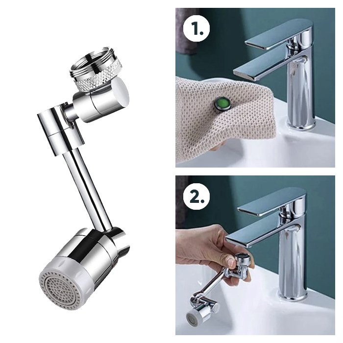Η περιστρεφόμενη και πτυσσόμενη προέκταση βρύσης ψεκασμού 1080° είναι κατάλληλη για χρήση στον νεροχύτη της κουζίνας, καθώς εξυπηρετεί πιο ευέλικτο το πλύσιμο λαχανικών, φρούτων, πιάτων ή χεριών και μπορεί να φτάσει σε όλες τις γωνίες του νεροχύτη, ενώ οι περισσότερες άλλες βρύσες δεν μπορούν. Είναι πολύ χρήσιμο για τα παιδιά, καθώς ορισμένα δυσκολεύονται να φτάσουν στη βρύση για να πλύνουν τα χέρια ή το πρόσωπό τους. Για χρήση στο νεροχύτη του μπάνιου, μπορείτε να πλένετε τα μαλλιά και το πρόσωπό σας πιο εύκολα. Ταυτόχρονα, η προέκταση της βρύσης με μεγάλη γωνία περιστροφής είναι πιο βολική για τον καθαρισμό ολόκληρου του νεροχύτη.
