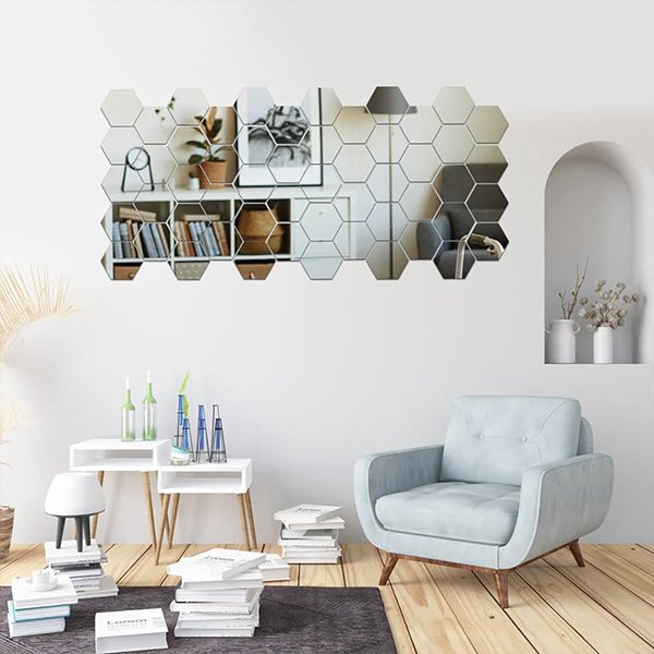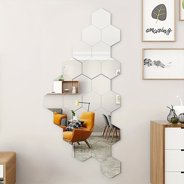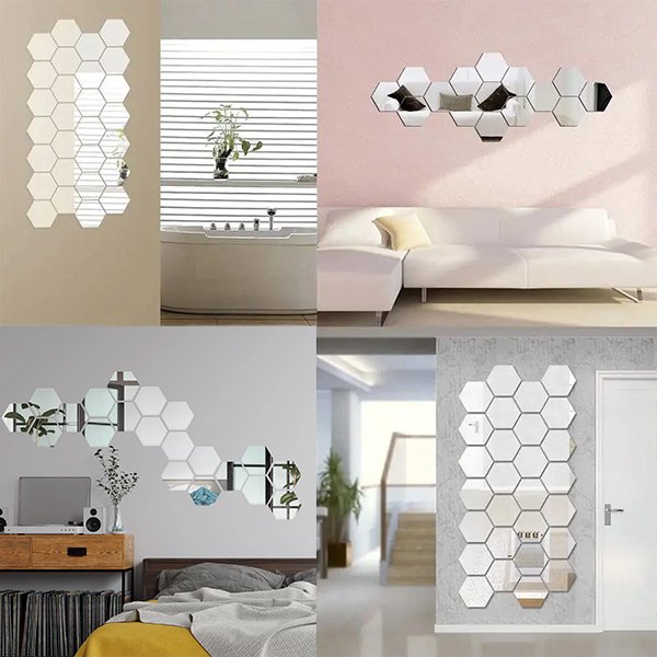 Τα αυτοκόλλητα είναι κατασκευασμένα από υψηλής ποιότητας ανακλαστικό υλικό που μιμείται την εμφάνιση ενός πραγματικού καθρέφτη. Κάθε αυτοκόλλητο έχει εξαγωνικό σχήμα, το οποίο προσθέτει μια μοντέρνα και στυλάτη πινελιά στους τοίχους σας.