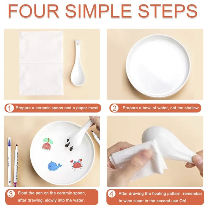 Όταν ανοίγετε το μαγικό στυλό νερομπογιάς και ζωγραφίζετε κάτι σε μια λεία επιφάνεια, είναι απαραίτητο να γεμίσετε το σχέδιο ομοιόμορφα και πρέπει να ξεκουραστεί για 5-10 δευτερόλεπτα για να στεγνώσει. Στη συνέχεια τοποθετήστε σιγά σιγά την επιφάνεια την οποία βάψατε σε νερό και ανακινήστε την αργά και απαλά ώστε να φύγει η μπογιά. Το στυλό είναι κατάλληλο για όλες τις λείες επιφάνειες όπως γυαλί, κεραμικά, πλαστικά προϊόντα, ξύλο, λευκό πίνακα, χαρτί κ.λπ.