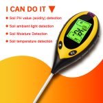 Με αυτόν τον μετρητή υγρασίας εδάφους, θερμοκρασίας, pH και ηλιακού φωτός 4-σε-1, μπορείτε εύκολα να προσαρμόσετε το πρόγραμμα ποτίσματος και λίπανσης στις ειδικές ανάγκες των φυτών σας, εξασφαλίζοντας ότι λαμβάνουν την ιδανική ποσότητα θρεπτικών συστατικών, νερού και ηλιακού φωτός για να ευδοκιμήσουν.